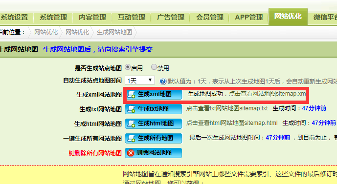 对应的网站优化中的目录地址也可以修改下地址:AppTplAdminDefaultSeo sitemap.html 这个里面的路径,可以改下测试