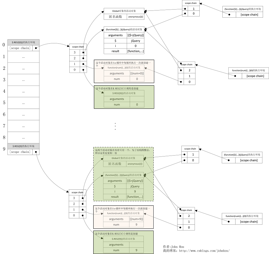 上面的代码先通过匿名函数表达式开辟了一块私有作用域,这个匿名函数就是我们上面所说的外层函数,该外层函数有一个参数$,同时还定义了变量result和 I , 通过for循环给数组result赋值一个匿名函数,这个匿名函数就是闭包,他访问了外层函数的变量I , 理论上数组result() 会返回相应的数组下标值,实际情况却不如所愿。