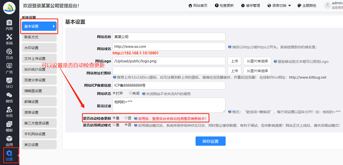 - 通过后台【设置】——》【基本设置】可以开启自动检查更新功能,如下图: