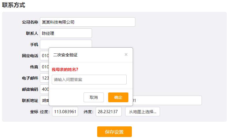 在某些特殊的情况下,如:系统密码泄露或被注入黑客脚本,被攻击者非法登录后台,这种情况下,如果设置了二次安全验证问题,攻击者也无法篡改网站资料。因此,强烈建议设置二次安全验证问题,系统将更加安全可靠,可有效防止黑客攻击