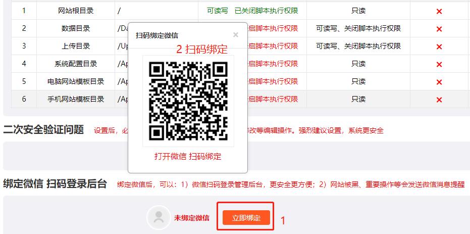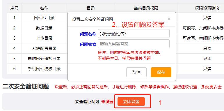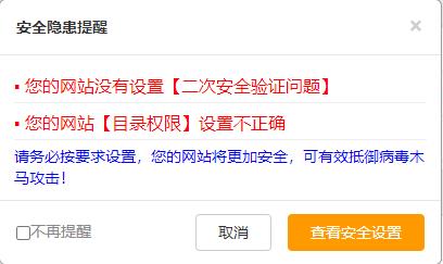 最后总结一下,不是每一个安全设置都必须使用,只有二次安全验证问题和目录权限这这2项才是必须的,请务必正确设置,如果未正确设置,每次登录后台都会弹框提醒。