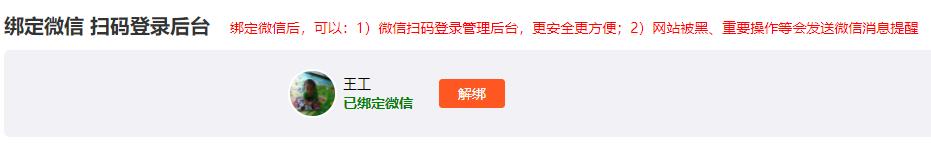 依次点击【设置】-【安全设置】找到绑定微信 扫码登录后台,然后点击【立即绑定】按钮,弹出二维码,用微信扫码即可绑定