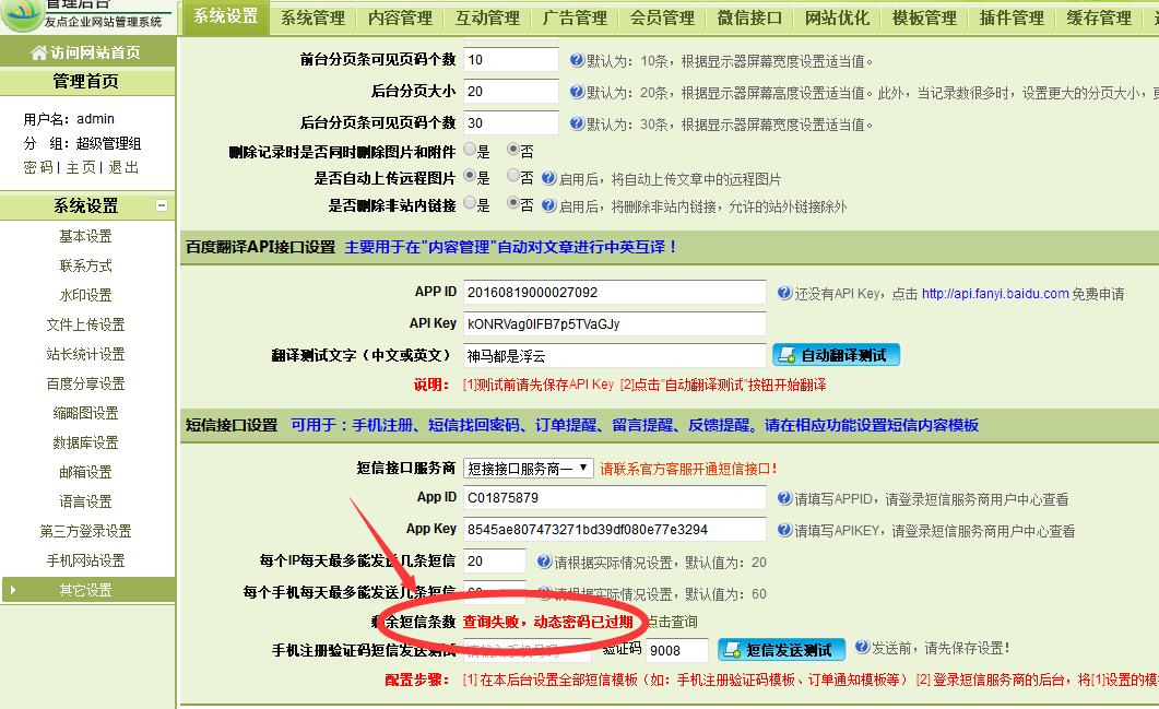 我们后台配置短信接口,出现短信接口问题 【查询失败,动态密码已过期】