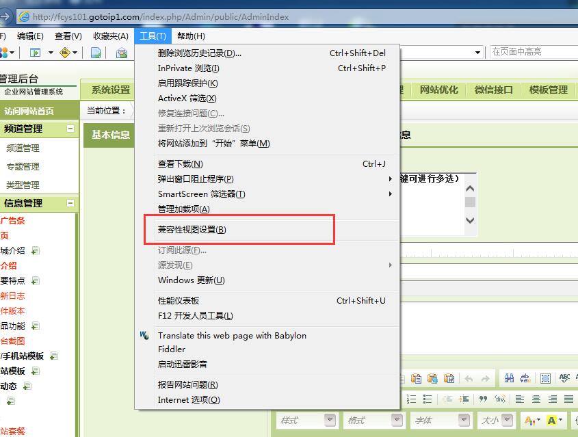 IE11浏览器打开后台添加内容,编辑器无法从服务器端选择上传图片,窗口无法关闭的解决办法,添加兼容性视图设置即可