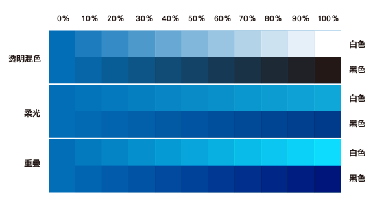 当然不同明度的色彩使用各种混合模式亦会得到不同的结果,高明度与低明度的色彩适用的混合方式并不同,建议可以依据自己的原始色彩多方尝试、快速取得最符合自己需要的色彩组合。