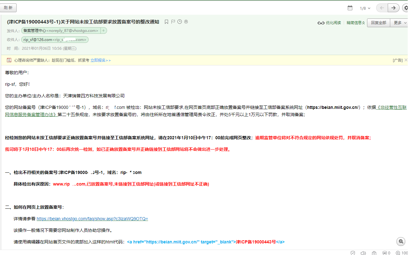 最近很多用户收到工信部发来“关于网站未按工信部要求放置备案号的整改通知”,邮件大致如下: