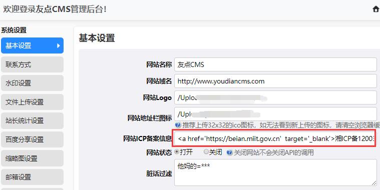 1、登录网站后台,在系统设置——》基本设置里——》找到“网站ICP备案信息”,如下图