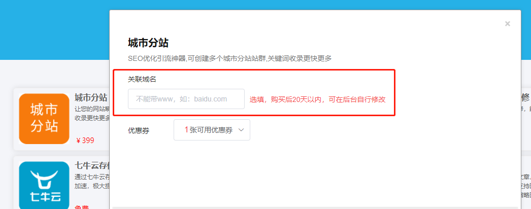 2)网站后台 - 应用 - 应用市场 - 城市分站 - 购买