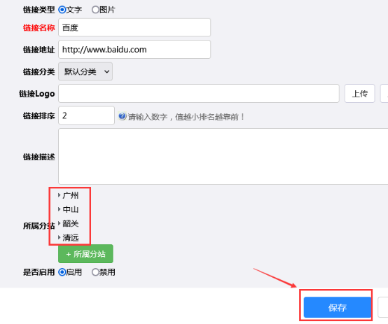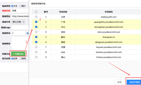 添加、修改友情链接时,可以设置所属分站