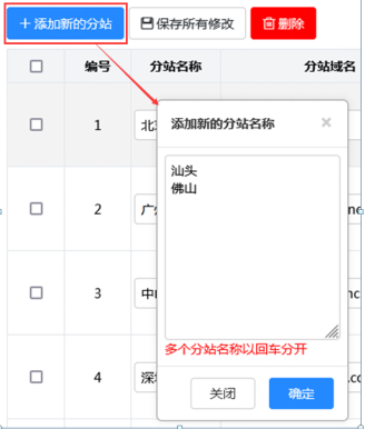 点击“添加新的分站”按钮,弹出对话框。输入分站名称并回车,可以批量添加多个分站。系统将自动获取中文分站名称的拼音加上主站域名,比如分站名称“广州”,当前网站域名为https://www.tuomacms.com/,则自动生成分站域名为:guizhou.tuomacms.com/