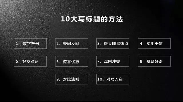 制造悬念好奇、与“性”相关、与“我”相关、包含冲突、利用具体数字、描绘细节、追热点傍大款、知乎体、运用对比、刺激痛点、提供解决方案、突出利益、营造紧迫气氛、强调稀缺性、标明地域、承诺价值、利用大V背书、盘点合集、前后添加修饰词、暗示危险、标题有指导建议、直接标明受益人、刺激情绪......等等。